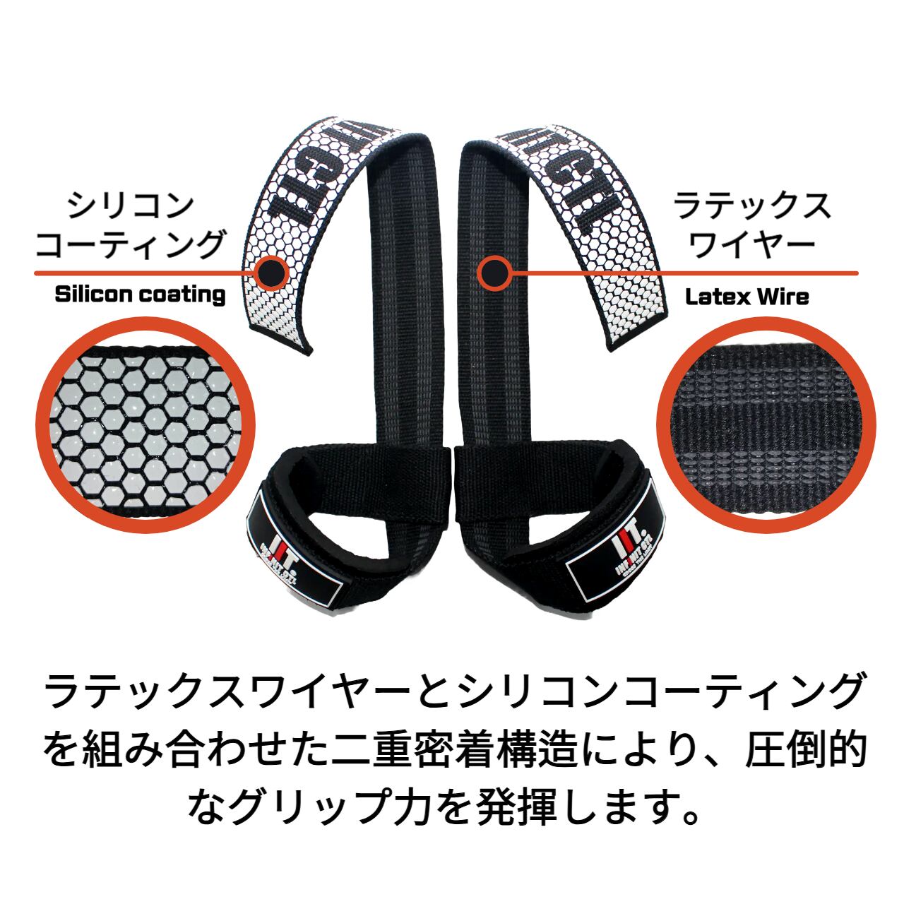 01. 独自のデュアル・グリップテクノロジー ストラップの内側に織り込まれた**「ラテックスワイヤー」と、外側の「シリコンコーティング」**が、バーと手のひらの間で強力な摩擦力を生み出します。金属製のバーベルでも滑ることのない、圧倒的なホールド力を体感してください。