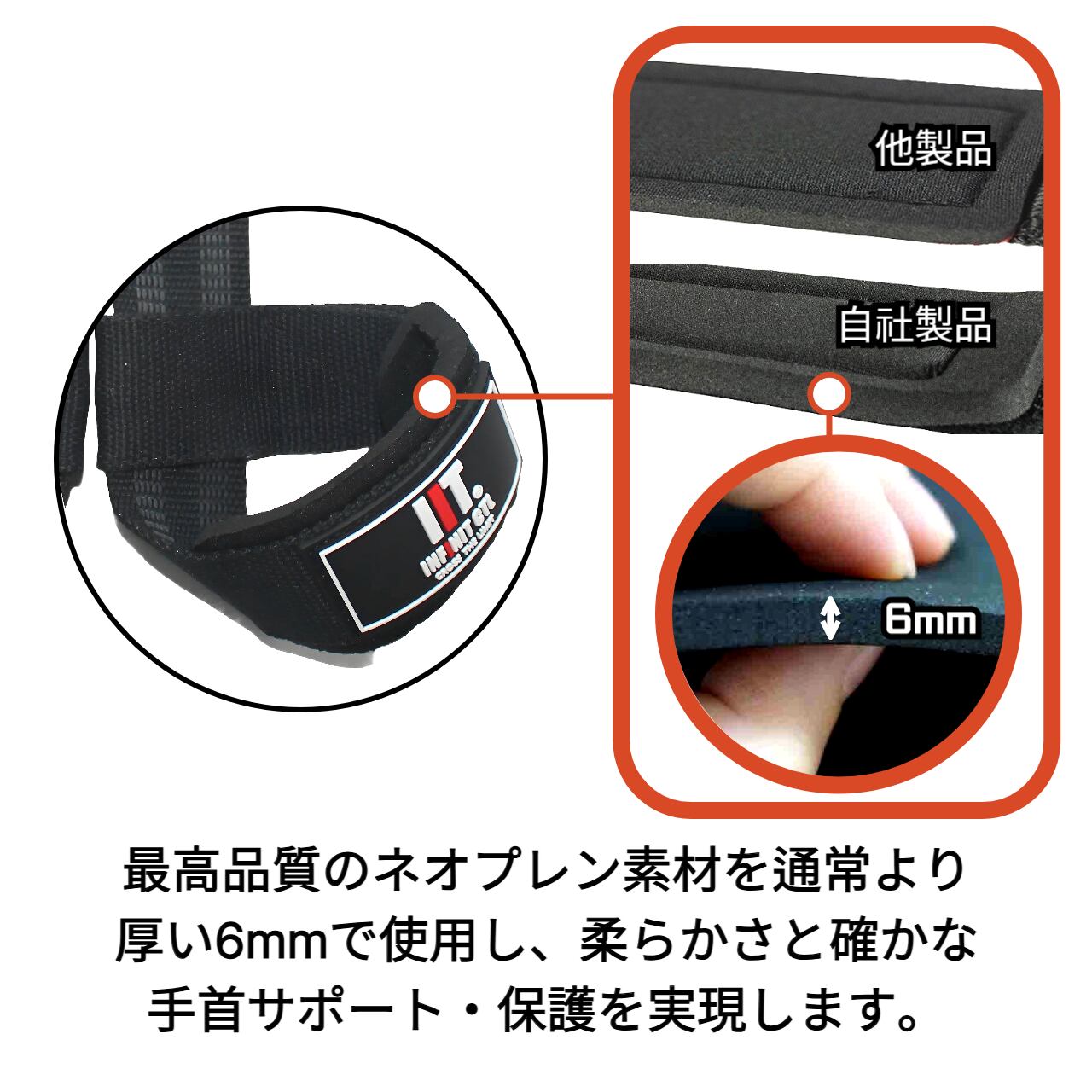 02. 6mm厚の高級ネオプレンによる手首保護 ウェットスーツにも使用される最高品質のネオプレンを採用。一般的な製品(4mm前後)を大きく上回る**「6mm厚」**のクッションが、手首への食い込みを防ぎ、高重量時の負荷を効果的に分散・吸収します。